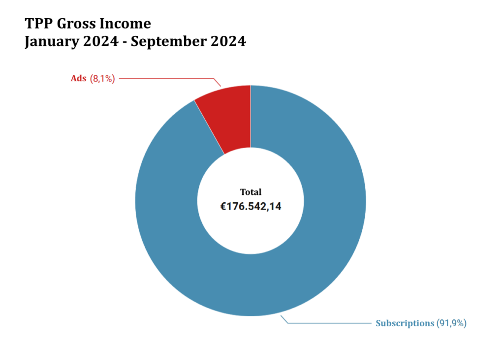 The graph below shows our income sources, mainly from subscriptions using a bottom-up financing model. Revenue from advertising is restricted to YouTube and Google Ads, ensuring our editorial integrity remains uncompromised by any corporate influence or transactions.