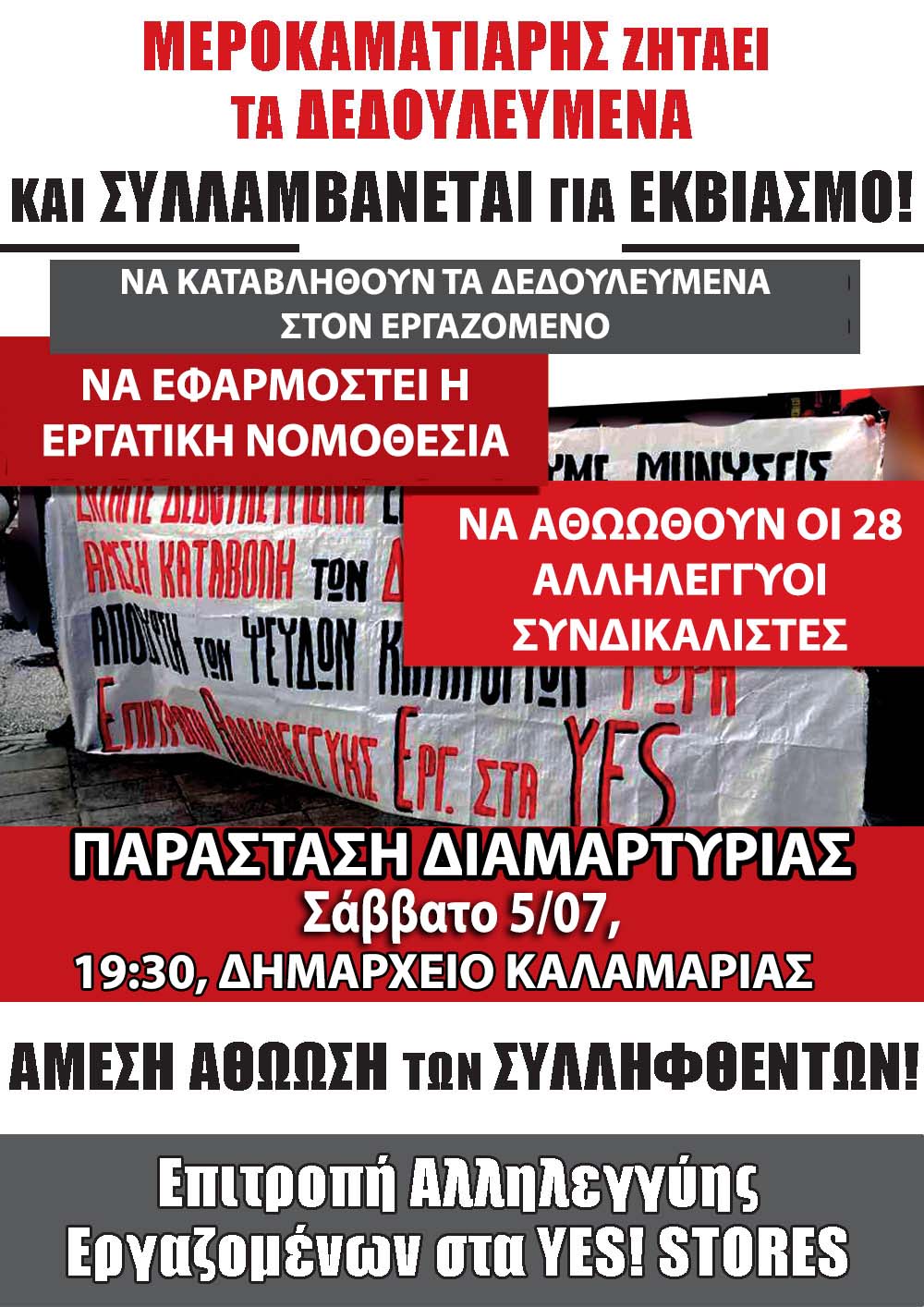 Την Παρασκευή 4 Ιουλίου, η αστυνομία με εντολή εισαγγελέα χτύπησε την συγκέντρωση διαμαρτυρίας για τον εργαζόμενο των YES στην Θεσσαλονίκη που διεκδικεί τα δεδουλευμένα του και την εφαρμογή της κλαδικής σύμβασης. Ο εργαζόμενος είχε βρεθεί κατηγορούμενος από μήνυση του εργοδότη για εκβιασμό. Η εργοδοσία σε συνεργασία με την ελληνική αστυνομία συνέλαβαν τον εργαζόμενο και συνάδελφο συνδικαλιστή, ύστερα από «παγίδα» του εργοδότη και της αστυνομίας για την «δήθεν» καταβολή των δεδουλευμένων. Αντί να καταβάλει τα δεδουλευμένα έκανε μήνυση στον εργαζόμενο και σε συνεργασία με το ελληνικό FBI του Μητσοτάκη συνέλαβαν τον εργαζόμενο και ένα συνδικαλιστή στην προγραμματισμένη συνάντηση. Στην δίκη που ακολούθησε ο εργαζόμενος και ο συνδικαλιστής του σωματείου επισιτισμού αθωώθηκαν πανηγυρικά. Μετά το δικαστήριο ο εργοδότης προχώρησε σε απόλυση του συναδέλφου.