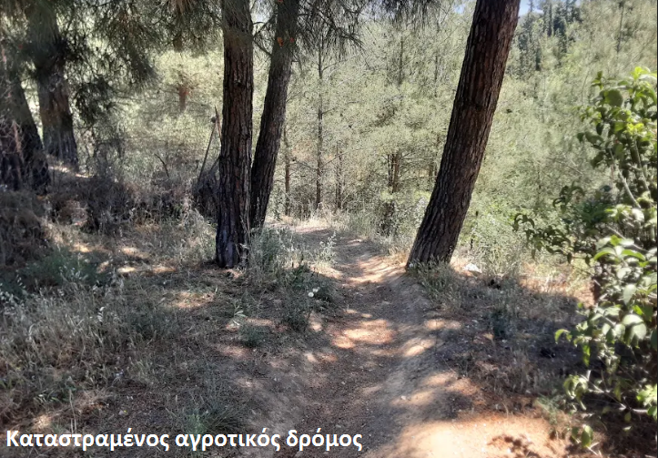Δύσβατο τμήμα δασικού δρόμου επιστρώθηκε με μπετόν, σε πλάτος 3ων και 4ων μέτρων, παρ όλο που η Πυροσβεστική δηλώνει ότι δεν περνά από δρόμο πλάτους μικρότερο των 5 μέτρων. Δεξιά και αριστερά υπάρχει ξηρή καύσιμη ύλη κλαδιών, πευκοβελόνων και συχνά και πεσμένων σάπιων πεύκων, από την πυργαγιά του ’97. Πρόκειται για κανονικά προσανάματα.