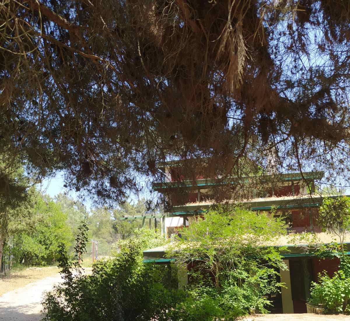 Η έξοδος της κατοικίας βρίσκεται κάτω από μία συστάδα μεγάλων, πυκνών πεύκων.
