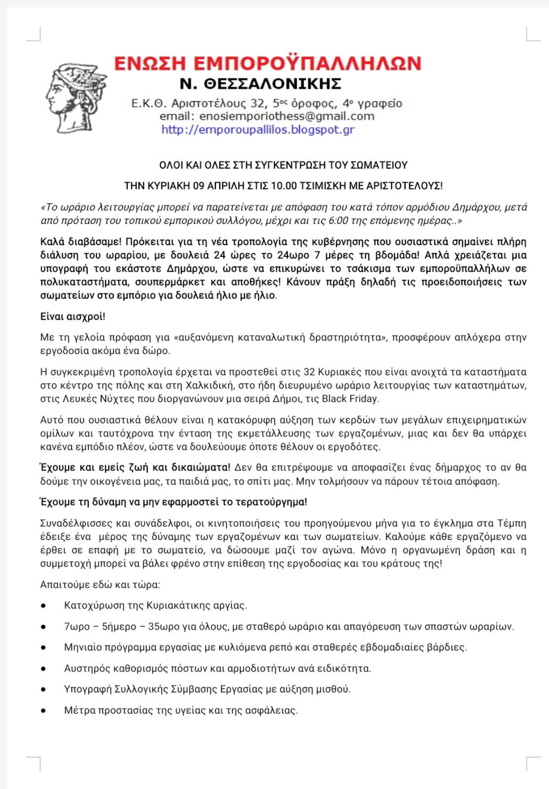 Μέλη της Ένωσης Εμποροϋπαλλήλων νομού Θεσσαλονίκης συγκεντρώθηκαν στη συμβολή των οδών Τσιμισκή με Αριστοτέλους και διαμαρτυρήθηκαν ενάντια στην κυριακάτικη εργασία και στη διεύρυνση του ωραρίου των καταστημάτων, ζητώντας να αποσυρθεί η νέα τροπολογία της κυβέρνησης που επιτρέπει την διεύρυνση του ωραρίου με απλή απόφαση του κατά τόπου δήμαρχου.