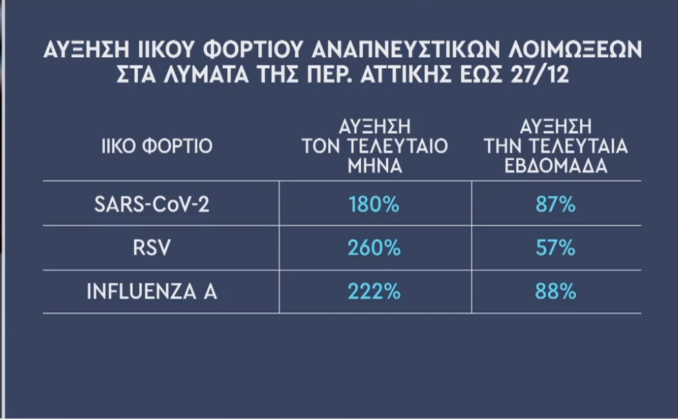 «Προφανώς το υλικό φορτίο του κορονοϊού είναι πολύ μεγαλύτερο από τα άλλα δύο, αλλά το ότι συνυπάρχουν και οι άλλοι δύο ιοί (γρίπη και RSV) κάνει το κοκτέιλ αυτό αρκετά σοβαρό» ανέφερε διευκρινίζοντα ότι η τελευταία εβδομάδα του 2023 έδειξε αυξήσεις της τάξης του 85 – 90% σε αυτούς τους ιούς και αυτό σημαίνει ότι τις επόμενες δύο τρεις εβδομάδες θα έχουμε ακόμα μεγαλύτερο ιικό φορτίο.