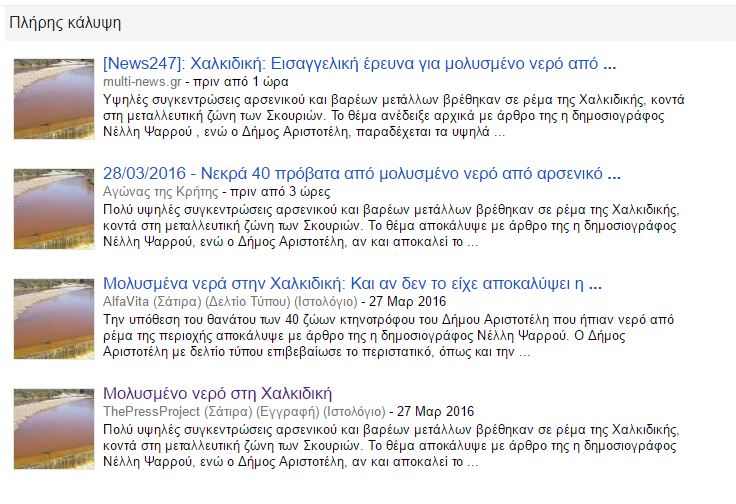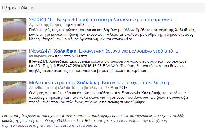 Κοιτάζοντας όμως τα στατιστικά του TPP αυτές τις ημέρες ξαφνικά συνειδητοποίησα ότι σχεδόν κανείς δεν ερχόταν από την υπηρεσία της Google κάτι που μου φάνηκε παράξενο. Έκανα λοιπόν μια αναζήτηση στην υπηρεσία και ανακάλυψα όντως ότι κανένα από τα θέματα μας δεν προτείνεται ως πηγή ανάγνωσης. Σκέφτηκα λοιπόν ότι αυτό συμβαίνει επειδή είμαστε σχετικά καινούριοι στο σπορ και προφανώς προκρίνει πρώτα τους παλαιότερους συνεργάτες οπότε έκανα μια αναζήτηση με τη λέξη “Χαλκιδική” αφού εμείς αναδείξαμε πρώτοι την υπόθεση με το αρσενικό (διόρθωση: όχι εξασθενές χρώμιο) που βρέθηκε στο ρέμα.