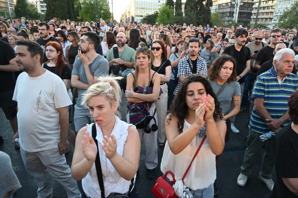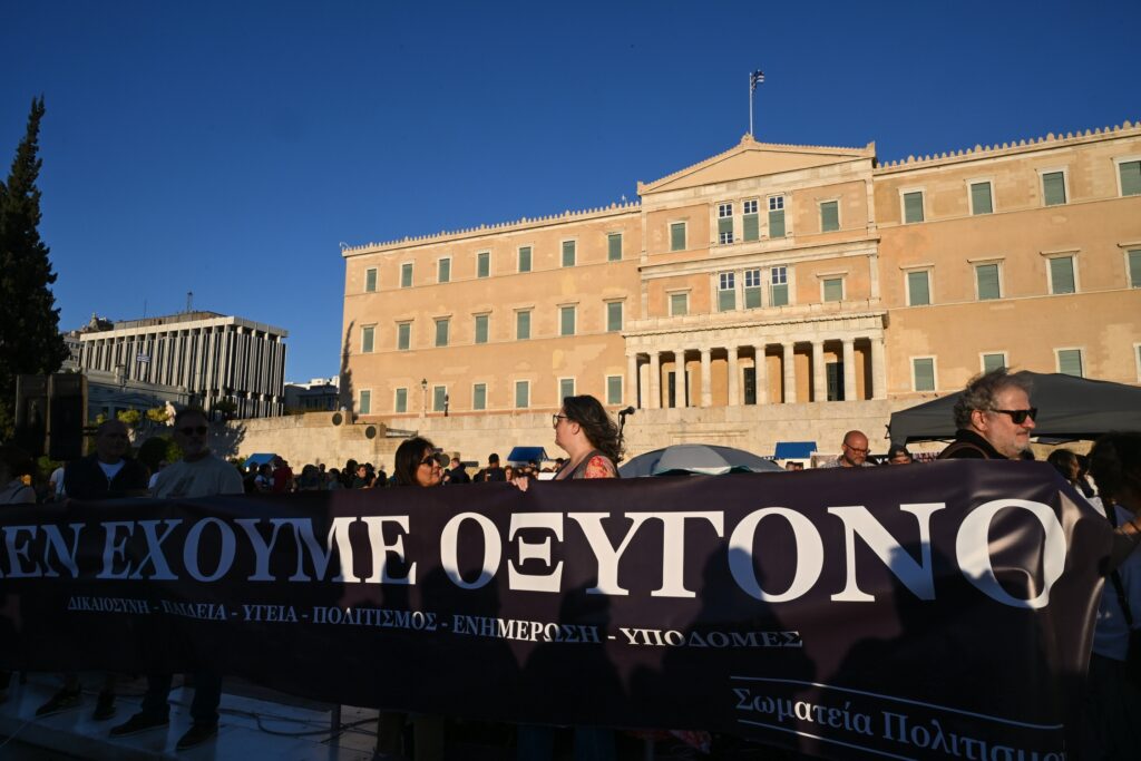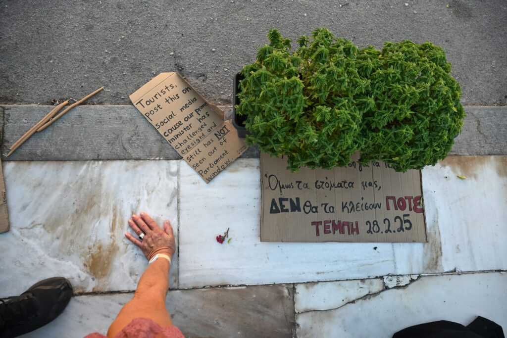Nωρίτερα, οι διαδηλωτές πέρασαν μπροστά από το Σύνταγμα, όπου βρισκόταν για 7η ημέρα ο απεργός πείνας και πατέρας του 22χρονου Ντένις, θύματος του εγκλήματος των Τεμπών, Πάνος Ρούτσι, με αίτημα την εκταφή του παιδιού του.