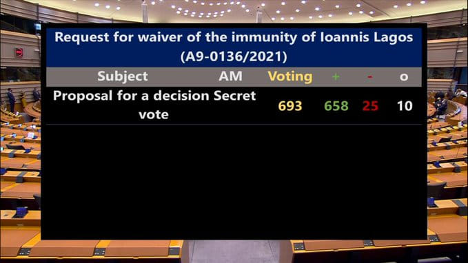 Η Ολομέλεια του Ευρωκοινοβουλίου αποφάσισε την άρση ασυλίας του Ι. Λαγού. Η ψηφοφορία διενεργήθηκε το απόγευμα της Δευτέρας και τα αποτελέσματά της ανακοινώθηκαν πριν από λίγο, 658 ψήφισαν υπέρ και 25 κατά.