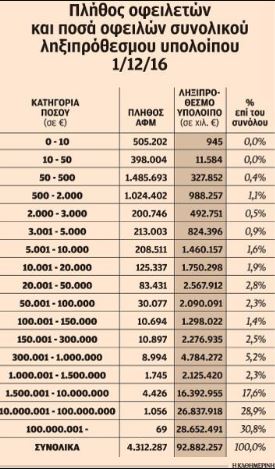 Από 1,5 εκατ. ευρώ έως 10 εκατ. ευρώ χρωστούν 4.426 οφειλέτες και το χρέος τους φθάνει στο ποσό των 16,3 δισ. ευρώ.