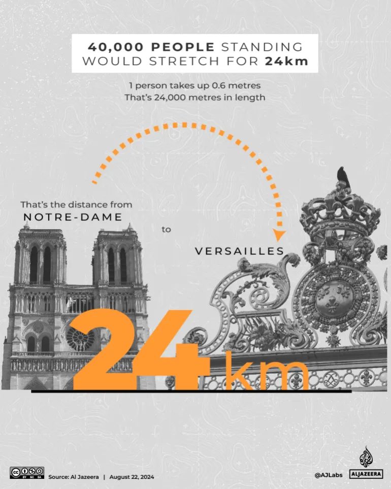 Αν 40.000 άνθρωποι στέκονταν σφιχτά ο ένας δίπλα στον άλλο στο Παρίσι, ο πρώτος θα βρισκόταν στην Παναγία των Παρισίων και ο τελευταίος στις Βερσαλλίες. Η ουρά θα είχε μήκος 24 χιλιόμετρα.