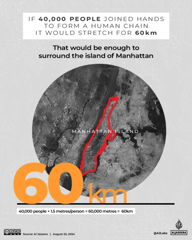 Αν 40.000 άνθρωποι ένωναν τα χέρια τους, όρθιοι, για να σχηματίσουν μια ανθρώπινη αλυσίδα, θα μπορούσαν να περικυκλώσουν ολόκληρο το νησί του Μανχάταν.