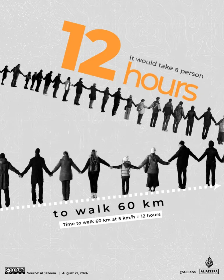 Ένας μέσος άνθρωπος που περπατάει με ταχύτητα 5 χιλιομέτρων την ώρα θα χρειαζόταν 12 ώρες για να περπατήσει από την αρχή αυτής της αλυσίδας μέχρι το τέλος.