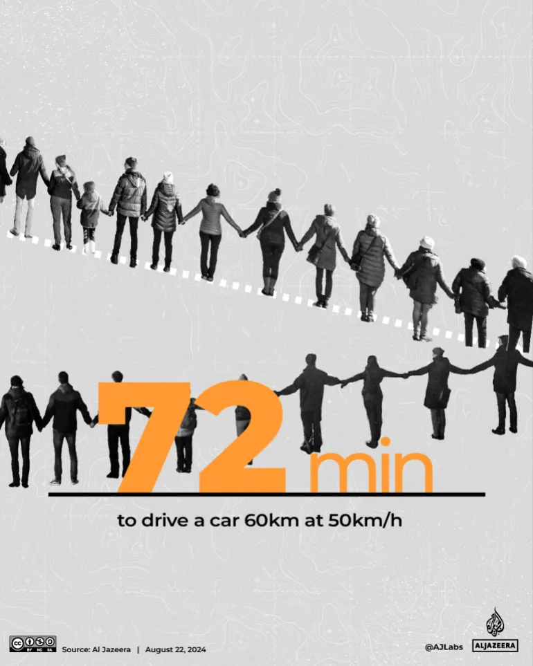 Για να διανύσει αυτά τα 60 χιλιόμετρα, ένα αυτοκίνητο σεντάν που κινείται με 50 χιλιόμετρα την ώρα θα χρειαστεί 72 λεπτά για να περάσει ολόκληρη τη γραμμή. Αυτό είναι περισσότερο από μία ώρα οδήγησης.