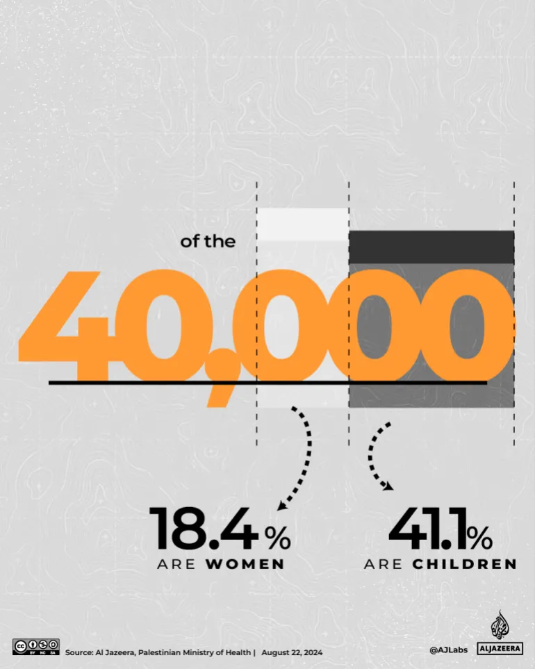 Από τους 40.000 νεκρούς, το 18,4% είναι γυναίκες και το 41,1% παιδιά. Στον πληθυσμό των δύο εκατομμυρίων κατοίκων της Γάζας πριν από τις 7 Οκτωβρίου, σχεδόν οι μισοί ήταν παιδιά.