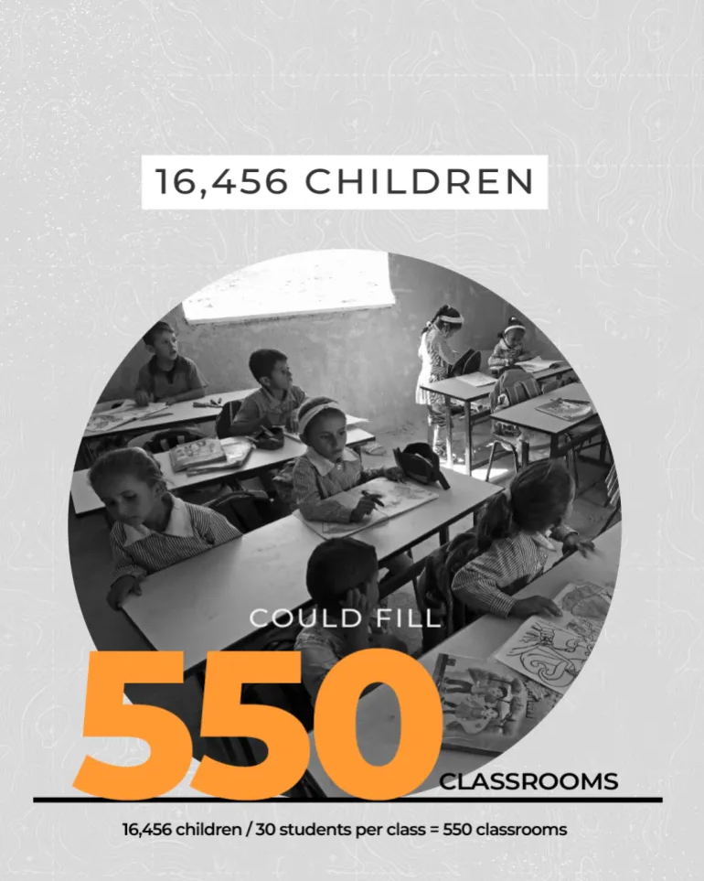 Από τους περισσότερους από 40.000 νεκρούς, σχεδόν 17.000 είναι παιδιά. Θα μπορούσαν να γεμίσουν 550 αίθουσες διδασκαλίας. Περισσότερα από 500 σχολεία που χρησιμοποιούνται ως καταφύγια έχουν στοχοποιηθεί από το Ισραήλ, τα περισσότερα από τα οποία έχουν υποστεί ζημιές και έχουν καταστραφεί. Στους 10 μήνες του πολέμου, τα παιδιά στη Γάζα έχασαν ένα ολόκληρο σχολικό έτος.