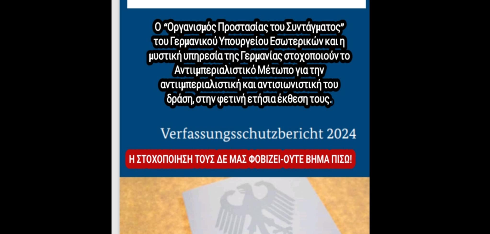 «Ο Γερμανικός “Οργανισμός Προστασίας του Συντάγματος” που υπάγεται στο Υπουργείο Εσωτερικών και σε συνεργασία με τη γερμανική μυστική υπηρεσία στοχεύει στην ποινικοποίηση του Αντιιμπεριαλιστικού Μετώπου. Στη φετινή προκλητική ετήσια έκθεση του, Οργανισμού για το 2024, σελίδα 272, με θέμα την «εξτρεμιστική δράση αριστερών οργανώσεων» συμπεριέλαβε στον κατάλογο του, το Αντιιμπεριαλιστικό Μέτωπο για τους παρακάτω λόγους: