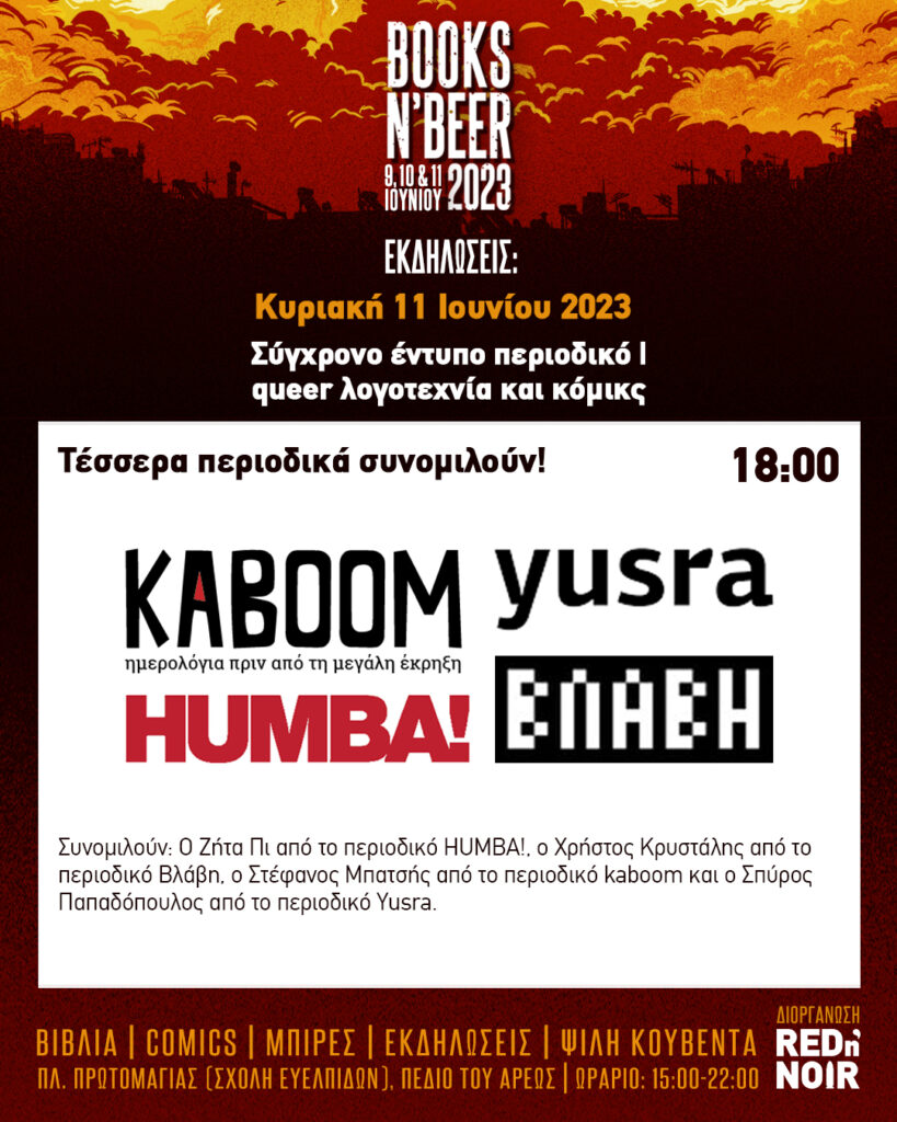 Οι εκδηλώσεις της Κυριακής θα ξεκινήσουν με την κουβέντα μεταξύ των περιοδικών kaboom, yusra, humba και βλάβη, κυρίως ως ενός είδους ποδαρικό στην κυκλοφορία του τελευταίου.