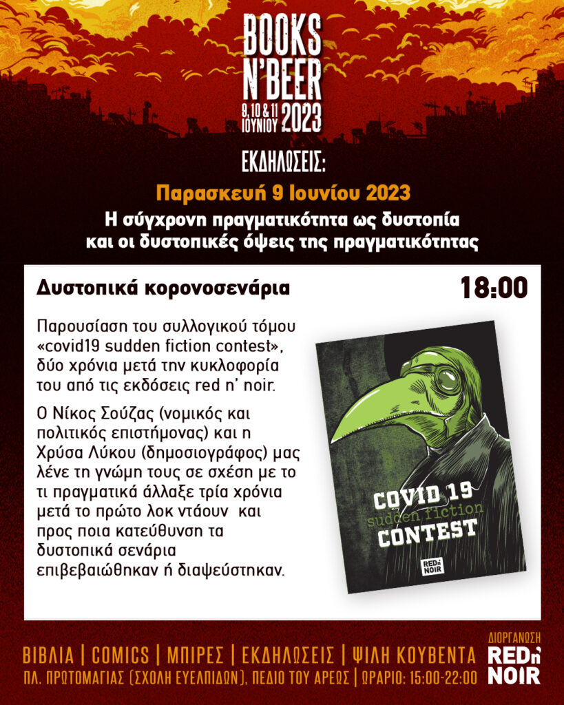 Η πρώτη μέρα του «books n’ beer 2023» (Παρασκευή 9 Ιουνίου 2023), θα έχει θέμα τη σύγχρονη πραγματικότητα ως δυστοπία και τις δυστοπικές όψεις της πραγματικότητας.