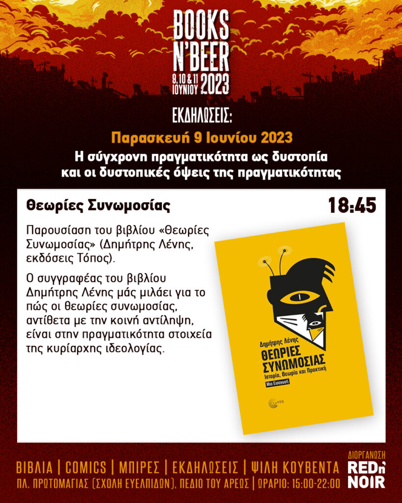 Δεύτερη εκδήλωση θα είναι η παρουσίαση του (υπό έκδοση) βιβλίου «Θεωρίες Συνωμοσίας» του Δημήτρη Λένη από τις εκδόσεις Τόπος.