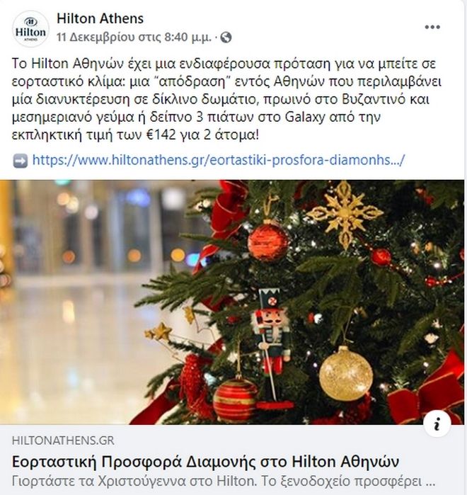 Στην ανάρτησή του με την οποία διαφημίζει το «προϊόν» που απευθύνεται προφανώς στους κατοίκους της Αθήνας και όχι σε τουρίστες που έρχονται στη χώρα, το ξενοδοχείο αναφέρει πως «έχει μια ενδιαφέρουσα πρόταση για να μπείτε σε εορταστικό κλίμα». Συγκεκριμένα, αναφέρεται σε μία «απόδραση» εντός Αθηνών, που περιλαμβάνει «μία διανυκτέρευση σε δικλινο δωμάτιο, πρωινό στο Βυζαντινό και μεσημεριανό γεύμα ή δείπνο τριών πιάτων» στο εστιατόριο του Χίλτον, με τιμή για δύο άτομα.