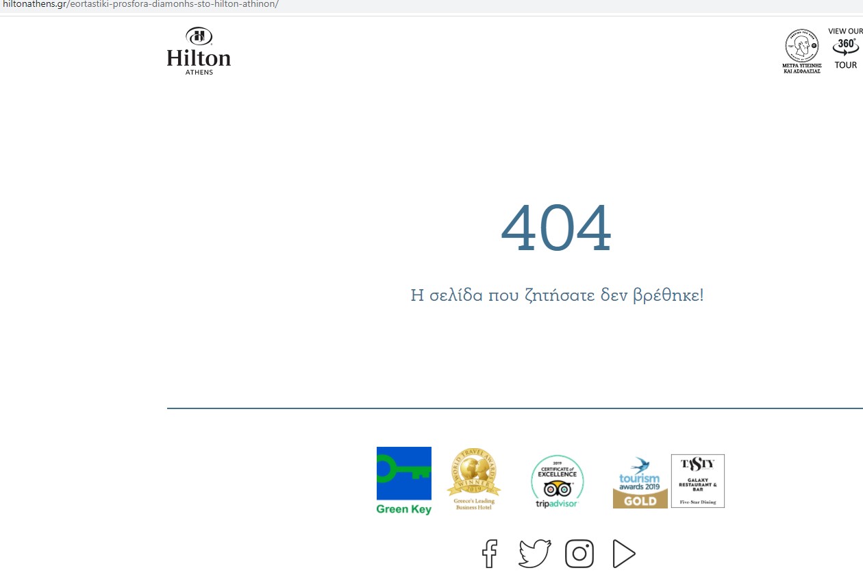 Αξίζει να σημειωθεί πως το μεσημέρι της Τρίτης, στην ιστοσελίδα του Χίλτον, η δημοσίευση που αφορά την «εορταστική προσφορά διαμονής» εμφανίζεται απενεργοποιημένη και εμφανίζει το μήνυμα «η σελίδα που ζητήσατε δεν βρέθηκε».