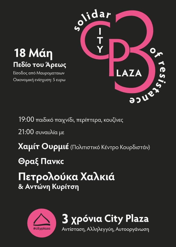 Η επέτειος των τριών χρόνων του City Plaza είναι ένα ακόμη κάλεσμα στον κόσμο της αντίστασης και την κοινωνία της αλληλεγγύης. Είναι επείγον και αναγκαίο να αγωνιστούμε για να σταματήσουν η εξαθλίωση στα Hot Spot των νησιών, οι παράνομες επαναπροωθήσεις στον Έβρο και το Αιγαίο, η μονιμοποίηση και επέκταση των άθλιων προσφυγικών στρατοπέδων. Να αγωνιστούμε για την ισότητα και την αλληλεγγύη των καταπιεσμένων. Για την ελευθερία μετακίνησης και την παραμονή με δικαιώματα!