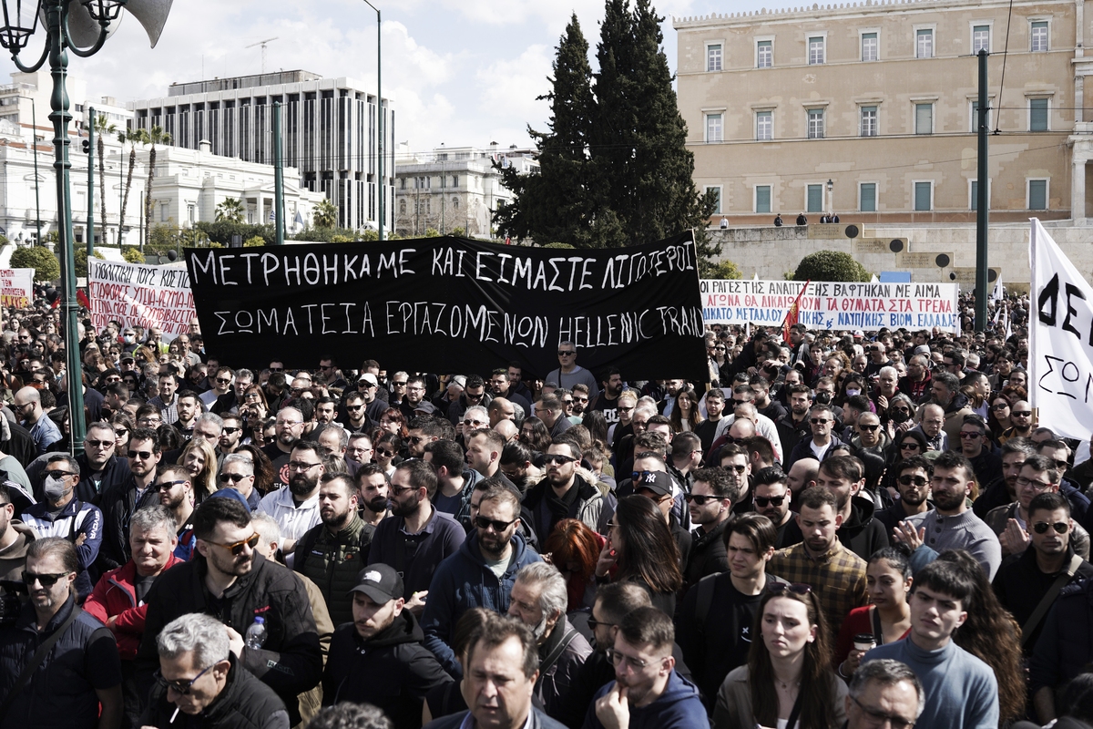 Πολίτες, φοιτητικοί σύλλογοι, φορείς, σωματεία και εργατικά κέντρα διαμαρτύρονται δυναμικά στο Σύνταγμα για τις ευθύνες της σημερινής κυβέρνησης, τις ολιγωρίες και την κακοδιαχείριση των κρατικών αρχών εδώ και χρόνια, για τον κατακερματισμό και το ξεπούλημα του ΟΣΕ.