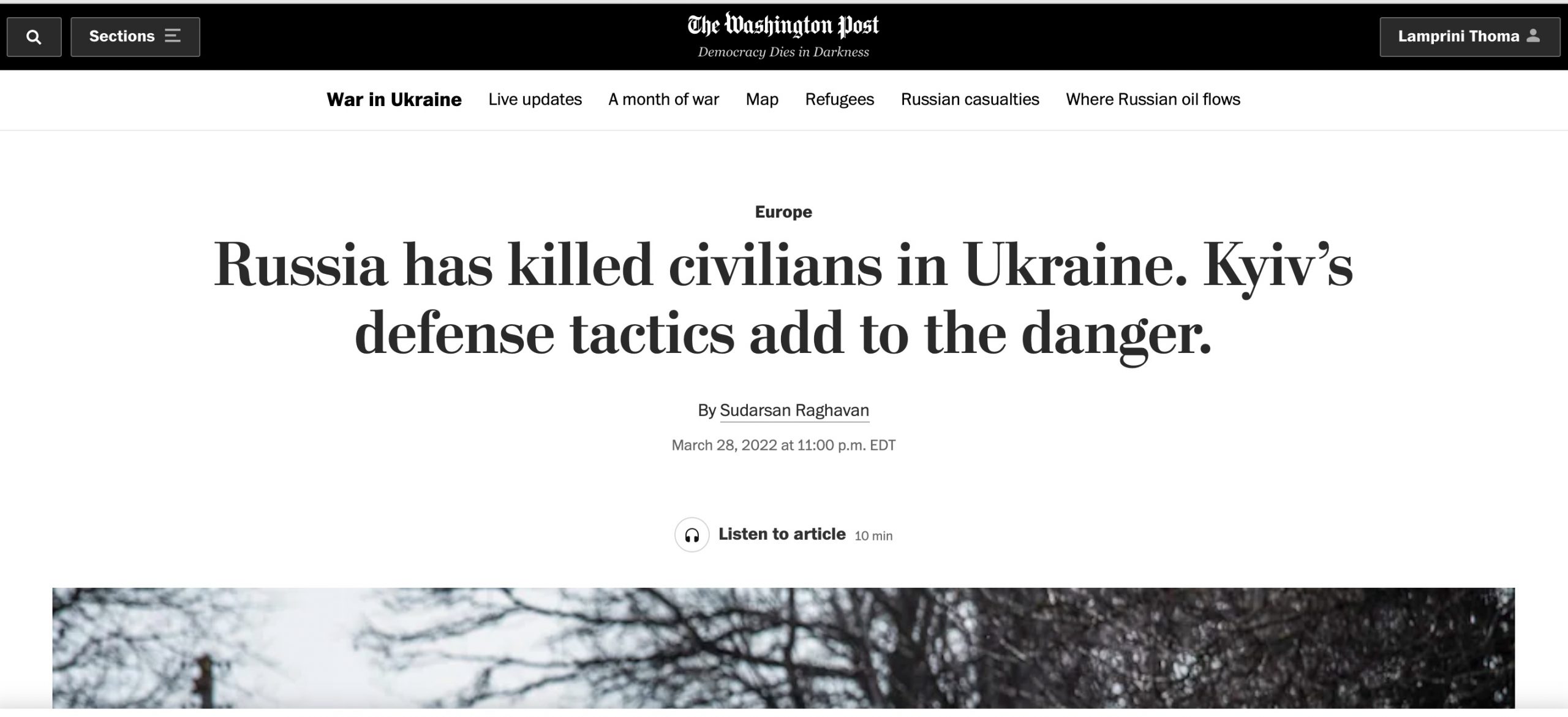 Ο τίτλος του άρθρου της Ουάσιγκτον Ποστ, περί ου ο λόγος: «Η Ρωσία σκότωσε άμαχους στην Ουκρανία. Οι αμυντικές τακτικές του Κιέβου αύξησαν τον κίνδυνο»: Russia has killed civilians in Ukraine. Kyiv’s defense tactics add to the danger. Αύξησαν τον κίνδυνο να σκοτώσουν οι ρώσοι άμαχους, γιατί χρησιμοποιούσαν τους άμαχους ως ασπίδες, εννοεί και το καταγράφει στο κείμενο. Το λέει, όμως, με ..τρόπο. Η «αύξηση του κινδύνου» ωστόσο, με την χρήση των αμάχων ως ασπίδων, αποτελεί αυτή καθ’ αυτή έγκλημα πολέμου, και μάλιστα όχι μόνον με βάση το διεθνές δίκαιο, αλλά με βάση και το αμερικάνικο δίκαιο.