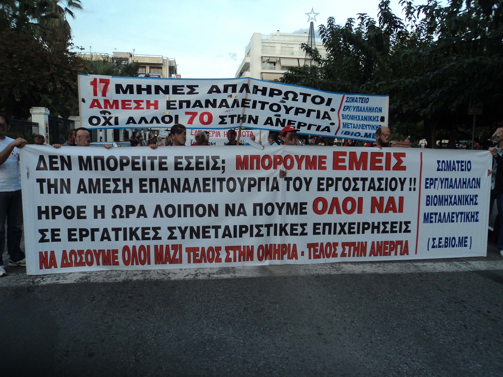 “Όταν τα εργοστάσια κλείνουν το ένα μετά το άλλο, οι άνεργοι πλησιάζουν τα 2 εκατομμύρια και οι συντριπτική πλειοψηφία της κοινωνίας καταδικάζεται σε φτώχεια και εξαθλίωση από την τρισυπόστατη κυβέρνηση της Τρόικας ΝΔ-ΠΑΣΟΚ-ΔΗΜΑΡ, όπως και από τις προηγηθείσες κυβερνήσεις, το αίτημα να περάσουν τα εργοστάσια στους εργάτεςείναι η αναγκαία απάντηση στην καταστροφή που βιώνουμε κάθε μέρα, η μοναδική απάντηση στην ανεργία· και για αυτό ο αγώνας της ΒιοΜε είναι και δικός μας αγώνας.” σημειώνουν ακόμη και καλούν όλους τους ανέργους κι εργαζομένους· “όλους όσους έχουν βιώσει την κρίση στο πετσί τους, να σταθούν δίπλα στους εργάτες της ΒιοΜε και να τους στηρίξουν τώρα που θα αρχίσουν να κάνουν πράξη ότι εμείς οι εργάτες μπορούμε χωρίς αφεντικά!”
