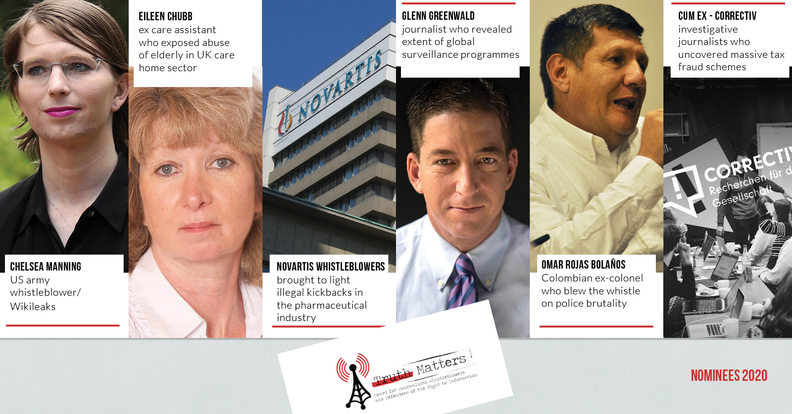 Ακόμα, μεταξύ των υποψηφίων βρίσκεται η Βρετανίδα μάρτυρας δημοσίου συμφέροντος με αποκαλύψεις για καταχρήσεις σε σπίτια φροντίδας, Ιλέεν Τσαμπ, και ο Κολομβιανός μάρτυρας δημοσίου συμφέροντος, Ομάρ Ρόχας Μπολάνιος. Έκτη υποψηφιότητα, με έντονο ελληνικό ενδιαφέρον, οι μάρτυρες δημοσίου συμφέροντος της υπόθεσης των παράνομων χρηματοδοτήσεων της Novartis στην Ελλάδα.