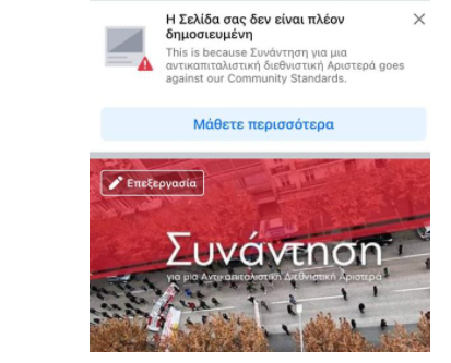«Στην περίοδο αυτής της σκληρής μάχης η δραστηριότητα μας στο fb βρέθηκαν στο στόχαστρο, ενημερωτική διαδικτυακή εκδήλωση λογοκρίθηκε/κατέβηκε, δημοσίευση έπαψε να εμφανίζεται και διαρκώς επικρέμονταν η απειλή να ρίξουν ολόκληρη την σελίδα μας. Τη σελίδα μιας πολιτικής οργάνωσης η οποία δεν συμμορφώθηκε με την κυρίαρχη αφήγηση που τόσο μανιασμένα είναι αποφασισμένη η κυβέρνηση να επιβάλλει. Αυτή η απειλή σήμερα έγινε πράξη: Η Σελίδα της Συνάντησης γμΑΔΑ δεν είναι πλέον δημοσιευμένη» αναφέρει σε ανακοίνωση της η πολιτική οργάνωση.