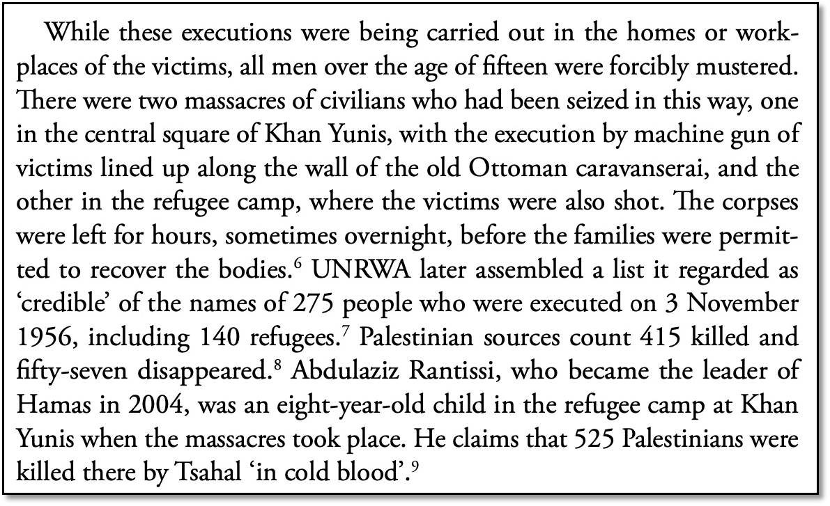 Σε αυτή την σύντομη κατοχή έγιναν πολλά εγκλήματα από τις ισραηλινές δυνάμεις που στο όνομα της αυτοάμυνας αναζητούσαν μέλη της αιγυπτιακής φρουράς και διοίκησης στον ντόπιο πληθυσμό. Τα εγκλήματα αυτά τα έχει αποτυπώσει με μοναδικό τρόπο o σκιτσογράφος Joe Sacco στο έργο του Footnotes in Gaza. Συνακόλουθα, οι Ισραηλινοί στρατιώτες έψαξαν, εντόπισαν και εκτέλεσαν πολλούς άνδρες στα σπίτια ή στις δουλειές τους. Σε δύο όμως τουλάχιστον περιπτώσεις μάζεψαν αδιάκριτα άνδρες από 15 χρονών και πάνω, τους έστησαν μπροστά από μια μάντρα και τους εκτέλεσαν με αυτόματα όπλα. Μάλιστα για ώρες δεν άφηναν τις οικογένειες να πλησιάσουν και να πάρουν τους νεκρούς τους. Σύμφωνα με τη σελίδα 271 του βιβλίου με τίτλο ‘Gaza: A History’ γραμμένο από τον Jean-Pierre Filiu το οποίο εκδόθηκε από το Oxford University Press το 2014 μαρτυράς σε ένα τέτοιο μακελειό ήταν ο 8 ετών τότε Αμπντέλ Αζίζ Αλ-Ραντίσι.