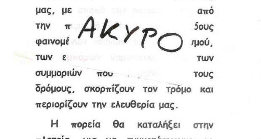Πάνω σε αφίσες, με τις οποίες οι κάτοικοι των Εξαρχείων καλούσαν σήμερα σε δημιουργία λαϊκής συνέλευσης και πορεία ενάντια στις μαφίες των Εξαρχείων, κάποιοι κόλλησαν αυτοκόλλητα με την ένδειξη «ΑΚΥΡΟ»