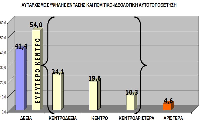 Από όσους απάντησαν στην κλασσική ερώτηση ιδεολογικο-πολιτικής αυτοτοποθέτησης στην κλίμακα αριστερά-δεξιά του ερωτηματολογίου μας, εκείνοι που εμφανίζουν αυταρχισμό υψηλής έντασης ανήκουν κατά κύριο λόγο στη δεξιά και στο ευρύτερο κέντρο. Μ’ άλλα λόγια, είναι το ευρύτερο κέντρο και η δεξιά που συναρτώνται προνομιακά με τα υψηλά επίπεδα αυταρχισμού. Όπως φαίνεται καθαρά στο παραπάνω γράφημα, όσοι αυτοτοποθετούνται στο ευρύτερο κέντρο αποτελούν το 54,0% όσων εκδηλώνουν υψηλά επίπεδα κοινωνικο-πολιτικού αυταρχισμού, και ακολουθούνται από αυτούς που αυτοτοποθετούνται στη δεξιά (41,4)%. Τέλος, όσοι αυτοτοποθετούνται στην αριστερά αποτελούν το 4,6% όσων παρουσιάζουν υψηλά επίπεδα κοινωνικο-πολιτικού αυταρχισμού.