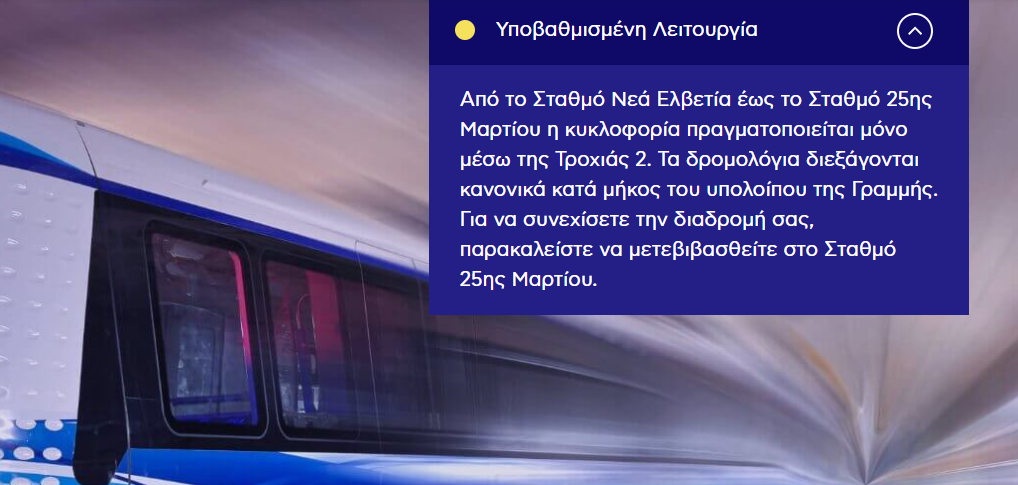 Μετά από πρόβλημα που εντοπίστηκε στον σταθμό 25ης Μαρτίου, η επίσημη ιστοσελίδα του μετρό Θεσσαλονίκης ενημερώνει πως η λειτουργία του είναι «υποβαθμισμένη» και «παρακαλεί σε μετεπιβίβαση».