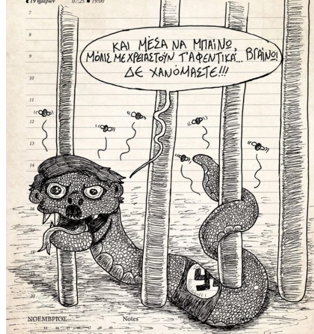 *σκίτσο του Γιώργου Μικάλεφ για την φυλάκιση των ναζί