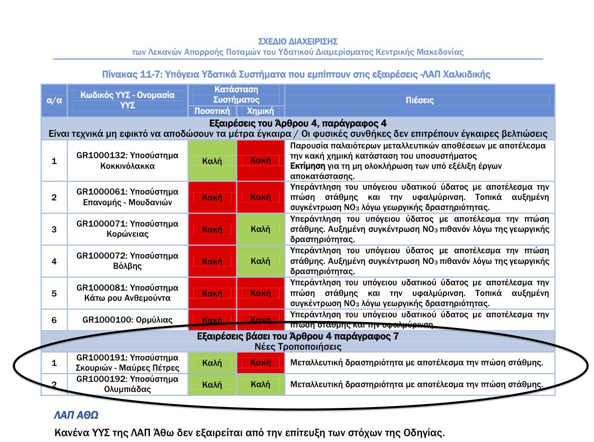 - Τα υπόγεια υδατικά υποσυστήματα της ΒΑ Χαλκιδικής ΕΞΑΙΡΕΘΗΚΑΝ συνολικά από την επίτευξη των στόχων της Οδηγίας-Πλαίσιο λόγω “νέων τροποποιήσεων”, με αιτιολογία την “πτώση στάθμης λόγω μεταλλευτικών δραστηριοτήτων”!
