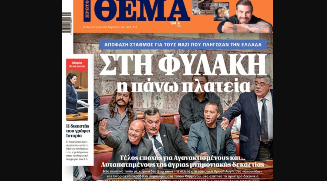 Ως επιστέγασμα συγκάλυψης και επιχείρησης ξαναγραψίματος της ιστορίας όλων των παραπάνω ήρθε σήμερα το χυδαίο ως προς τα κινήματα των ημερών εκείνων, ανιστόρητο και δόλιο πρωτοσέλιδο του Πρώτου Θέματος. Στο άρθρο του «Επιτέλους Ενώθηκαν! Όλοι τους Εναντίον της … Χρυσής Αυγής!» λίγες ώρες πριν την καταδικαστική απόφαση, ο αρχηγός της ναζιστικής συμμορίας χρησιμοποίησε για να επιτεθεί κατά… όλων τα υποστηρικτικά σχόλια των αναγνωστών της φυλλάδας για την «άδικη δίωξή» τους. Απόδειξη του κοινού που ακόμα και σήμερα απευθύνεται η φυλλάδα. Είναι αυτός ο λόγος που για ολόκληρο πρωτοσέλιδο για το «τέλος εποχής για αγανακτισμένους» δεν βρήκε ούτε μία φωτογραφία να βάλει, αλλά χρησιμοποίησε αυτή της εγκληματικής συμμορίας από τη Βουλή;
