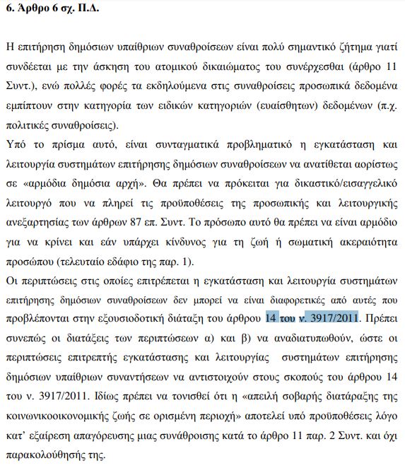 Σύμφωνα με τη σχετική γνωμοδότηση (29/6/2020) που έχει εκδώσει η Αρχή Προστασίας Δεδομένων Προσωπικού Χαρακτήρα, «είναι συνταγματικά προβληματικό η εγκατάσταση και λειτουργία συστημάτων επιτήρησης δημοσίων συναθροίσεων να ανατίθεται αορίστως σε “αρμόδια δημόσια αρχή”».
