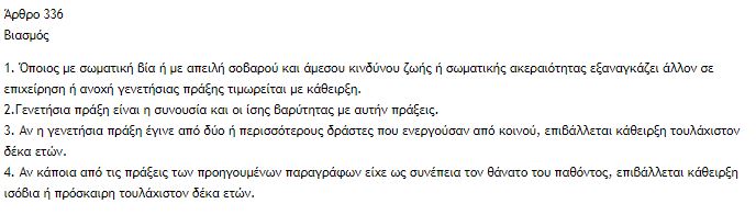 Την Τετάρτη, το Υπουργείο έβγαλε στη δημόσια διαβούλευση το σχέδιό του για την αναθεώρηση του Ποινικού Κώδικα. Σε αυτό, το άρθρο 336 με τον ορισμό του βιασμού τροποποιείται προς το χειρότερο. Όχι μόνο δεν αναφέρει καθόλου την ανάγκη συναίνεσης ως προϋπόθεση, αλλά επιχειρεί να αλλάξει την προϋπόθεση της γενικής «απειλής σπουδαίου και άμεσου κινδύνου» σε «σωματική βία ή με απειλή σοβαρού και άμεσου κινδύνου ζωής ή σωματικής ακεραιότητας».
