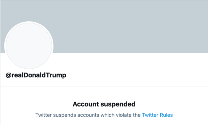 Αν κανείς μεταβεί στην αναζήτηση και πληκτρολογήσει @realDonaldTrump, τον προσωπικό λογαριασμό δηλαδή του προέδρου, δεν θα βρει αποτέλεσμα. Το μέσο είχε επιχειρήσει και αυτό να αναστείλειτον λογαριασμό του και να μειώσει έτσι την απήχηση Τραμπ, ωστόσο ο απερχόμενος πρόεδρος, επιχείρησε να παρακάμψει τη συγκεκριμένη απαγόρευση της πλατφόρμας και να διαδώσει τα μηνύματά του, είτε από τον λογαριασμό της προεκλογικής του καμπάνιας, είτε από τον επίσημο λογαριασμό της Αμερικανικής προεδρίας.