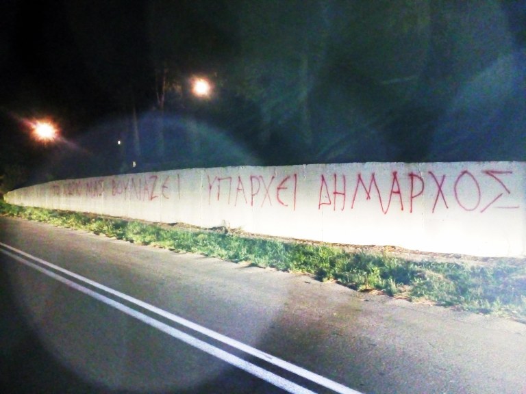 «ΤΟ ΧΩΡΙΟ ΜΑΣ ΒΟΥΛΙΑΖΕΙ. ΥΠΑΡΧΕΙ ΔΗΜΑΡΧΟΣ;» Το σύνθημα στον τοίχο του νεκροταφείου είναι η εισαγωγή στο «ρέκβιεμ» για τη Στρατονίκη.Ο Δήμαρχος επιχείρησε να το εξαφανίσει με βούρτσα και ασβέστη. Εμείς θα το μεταδώσουμε ολόκληρο.