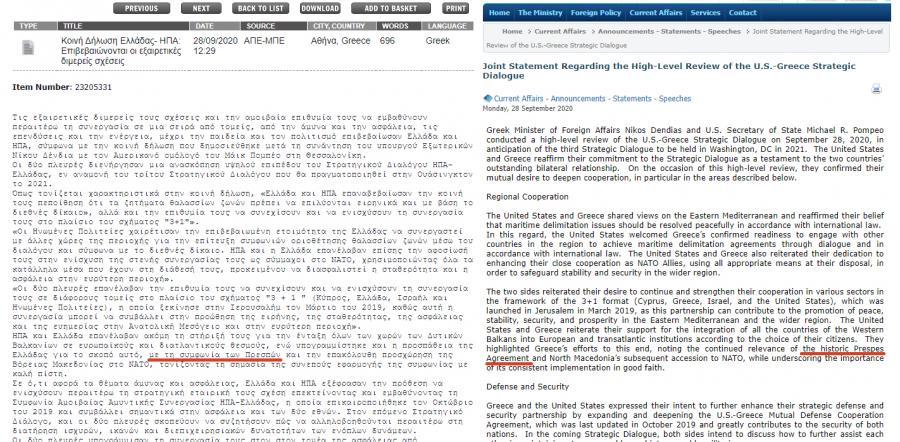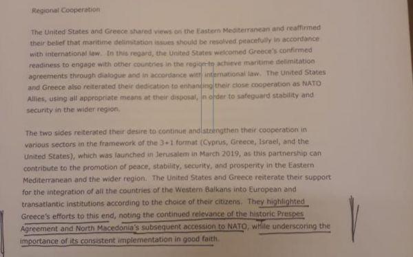 «The United States and Greece reiterate their support for the integration of all the countries of the Western Balkans into European and transatlantic institutions according to the choice of their citizens. They highlighted Greece’s efforts to this end, noting the continued relevance of the historic Prespes Agreement and North Macedonia’s subsequent accession to NATO, while underscoring the importance of its consistent implementation in good faith».