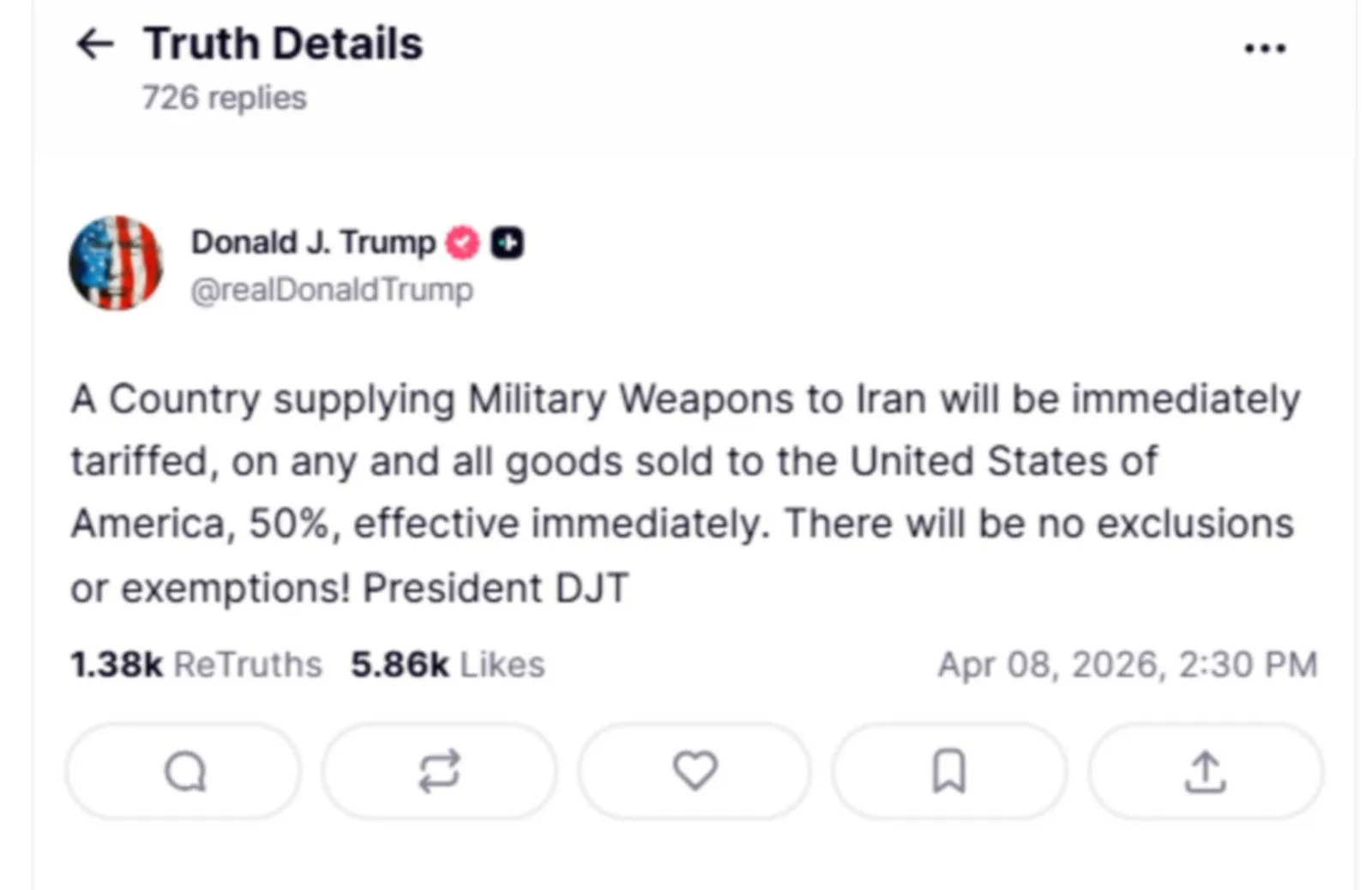 «Xώρα που προμηθεύει στρατιωτικά όπλα στο Ιράν θα υπόκειται άμεσα σε δασμούς 50% σε όλα τα αγαθά που πωλούνται στις Ηνωμένες Πολιτείες Αμερικής, με άμεση ισχύ. Δεν θα υπάρξουν εξαιρέσεις ή απαλλαγές!» ανέφερε χαρακτηριστικά.