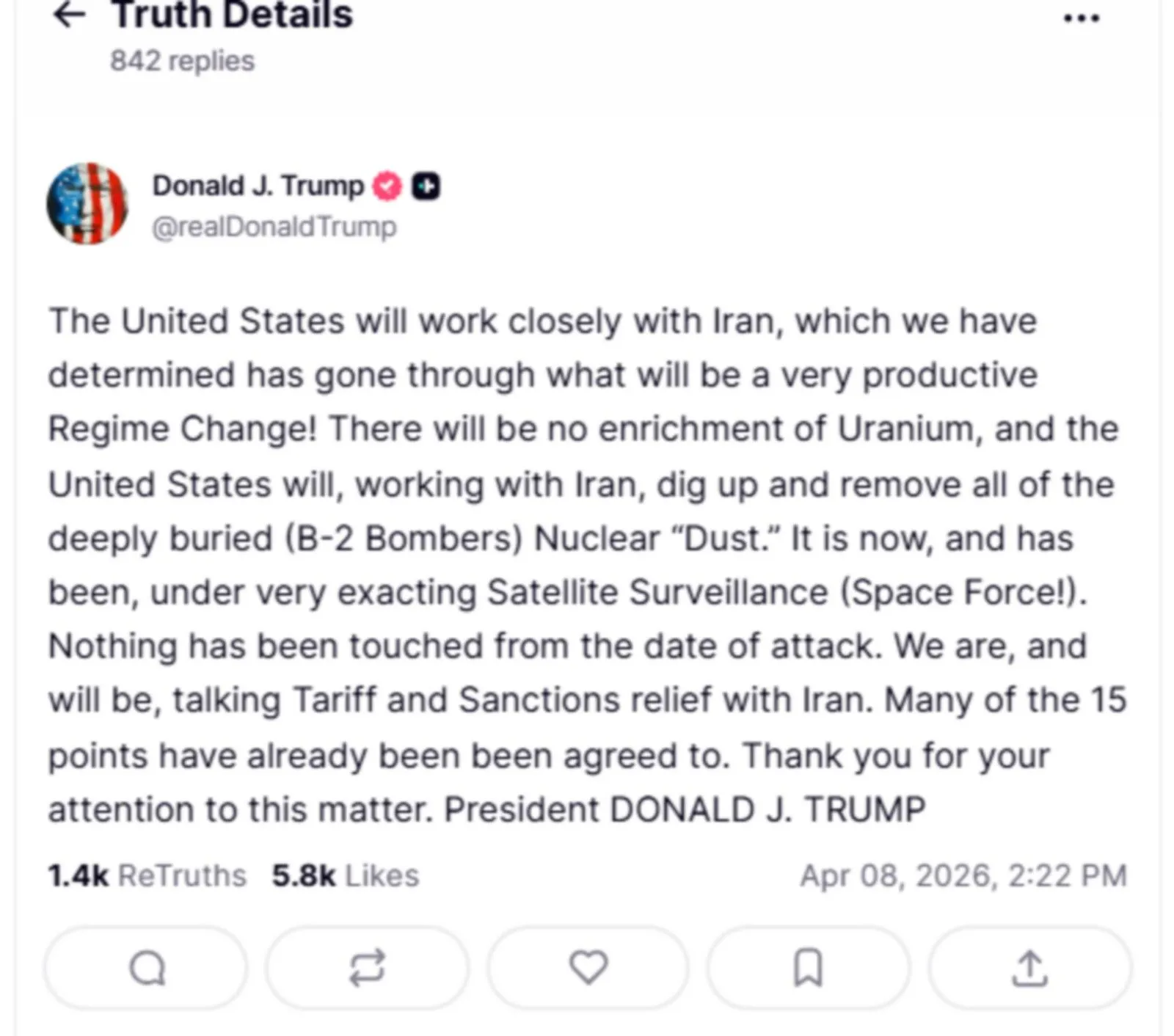 Συγκεκριμένα, ο Τραμπ έγραψε: «Οι Ηνωμένες Πολιτείες θα συνεργαστούν στενά με το Ιράν, το οποίο, όπως έχουμε διαπιστώσει, έχει περάσει από μια πολύ παραγωγική αλλαγή καθεστώτος! Δεν θα υπάρξει εμπλουτισμός ουρανίου και οι Ηνωμένες Πολιτείες, σε συνεργασία με το Ιράν, θα σκάψουν και θα απομακρύνουν όλη την βαθιά θαμμένη (Βομβαρδιστικά B-2) πυρηνική “σκόνη”. Αυτή τη στιγμή βρίσκεται, και βρίσκεται, υπό πολύ αυστηρή δορυφορική επιτήρηση (Διαστημική Δύναμη!)».