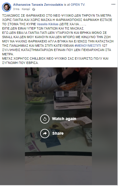 Το βίντεο ανέβασε στον προσωπικό του λογαριασμό ο χρήστης «Athanasios Tanasis Zervoudakis», που φέρεται να είναι εκείνος που πρωταγωνιστεί. Όπως φαίνεται, έχει επισκεφθεί κάποιο φαρμακείο της περιοχής στο Νέο Ψυχικό, και όταν βρίσκεται στο ταμείο, εξανίσταται κατά της φαρμακοποιού που δεν φοράει γάντια.
