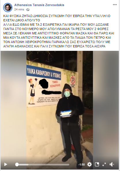 Αποδεικνύοντας τέλος, πως το θράσος του δεν έχει όρια, ο ίδιος εμφανίστηκε αργά το βράδυ της Δευτέρας σε νέο του βίντεο, μπροστά από ταμπέλα επιχείρησης εμπορίου υλικών καθαρισμού και υγιεινής, να «απολογείται», και να διαφημίζει την επιχείρηση.