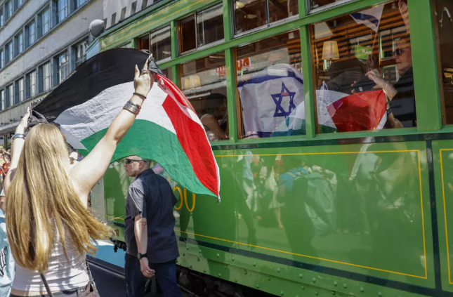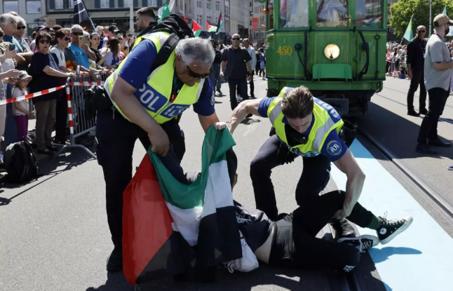 Πλήθος κόσμου, όμως, βρέθηκε εκεί για να αντιδράσει στην ισραηλινή συμμετοχή. Καθώς η παρέλαση ξεκίνησε έξω από το εμβληματικό δημαρχείο της Βασιλείας, περίπου δώδεκα παλαιστινιακές σημαίες φαίνονταν να κυματίζουν στο πλήθος, ενώ ένα πανό έγραφε: «Ισραήλ: ανοίξτε τα σύνορα της Γάζας. Αφήστε τη βοήθεια να περάσει».