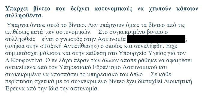 «Υπάρχει βίντεο -δεν το έδωσε στη δημοσιότητα η κυβέρνηση- που δείχνει την εικόνα ξυλοδαρμού ενός εκ των συλληφθέντων. Αυτό που θέλω να σας πω είναι ότι η κυβέρνηση δεν δρα ως κουκουλοφόρος. Υπάρχουν πρόσωπα γνωστά. Υπάρχει περιστατικό που διερευνάται και σε κάθε περίπτωση πρόσωπα που φαίνονται στην κάμερα, είναι πρόσωπα που φαίνονται στην κάμερα» δήλωσε η κυβερνητική εκπρόσωπος όταν κλήθηκε να απαντήσει σε σχετικό ερώτημα, μην καταφέρνοντας να κρύψει την αμηχανία της.