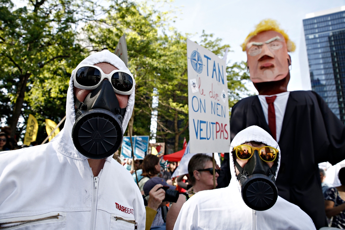 Την ίδια ώρα, διαδήλωση «εναντίον του Τραμπ» και εναντίον του NATO, πραγματοποείται στο περιθώριο της συνόδου κορυφής της Ατλαντικής συμμαχίας. Το κάλεσμα στη διαδήλωση έκαναν αρχικά ενώσεις φοιτητών της Γάνδης (βορειοδυτικά) και των Βρυξελλών. Κατόπιν στην κινητοποίηση κάλεσαν επίσης μη κυβερνητικές οργανώσεις όπως η Oxfam, η Διεθνής Αμνηστία και η Greenpeace, συνδικάτα και πολιτικά κόμματα της αριστεράς. Πρόκειται για μια διαδήλωση υπέρ της ειρήνης, εξήγησε ένα στέλεχος της ένωσης Δράστε για την Ειρήνη, ο Ζερόμ Περαγιά, που συμμετάσχει.