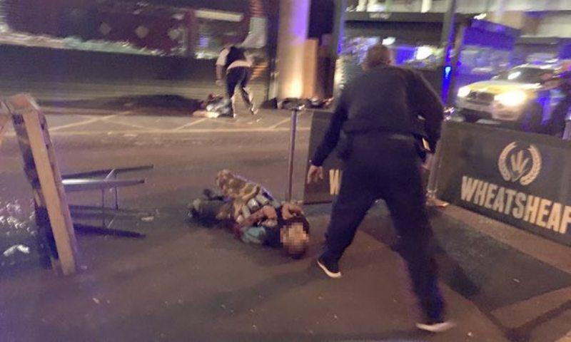 «Πυροβολισμοί ακούστηκαν» στο Μπόροου Μάρκετ, επεσήμανε η αστυνομία, ενώ σε μια φωτογραφία που τράβηξε περάστικός φαίνονται δύο άνθρωποι να κείτονται στο έδαφος, τουλάχιστον ένας εκ των οποίων φορά ένα παντελόνι παραλλαγής και μια ζώνη στην οποία φαίνονται μια σειρά από κυλινδρικά αντικείμενα.