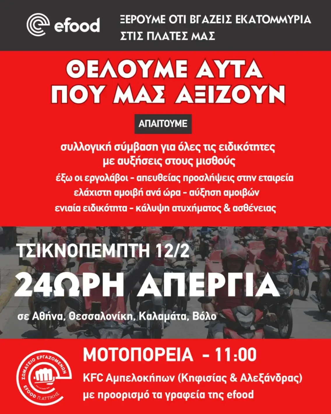 Η δύναμή μας βρίσκεται στην ενότητα, τη μαζικότητα και την περιφρούρηση του αγώνα μας. Όπως στις στάσεις εργασίας, έτσι και στην απεργία, στεκόμαστε ο ένας δίπλα στον άλλον, μπλοκάρουμε την παραγωγή και στηρίζουμε τη συλλογική μας απόφαση. Να μην τσιμπήσει κανένας συνάδελφος στα extra bonus που θα μοιράσει η Efood εκείνη την ημέρα. Πρόκειται για ξεκάθαρη προσπάθεια εξαγοράς συνειδήσεων και συγκρότησης απεργοσπαστικού μηχανισμού, που στόχο έχει να σπάσει την απεργία, να μας διχάσει και να υπονομεύσει τον κοινό μας αγώνα. Κανείς δεν μπορεί να ισχυριστεί ότι «δεν ήξερε». Η στάση του καθενός έχει συνέπειες και κρίνεται συλλογικά.