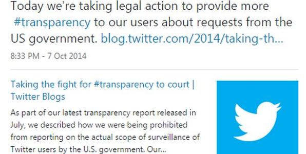 Όπως γράφει σε δημοσίευσή του στο blog του Twitter ο Μπεν Λι, αντιπρόεδρος (νομικά) του Twitter, «στο πλαίσιο της τελευταίας αναφοράς διαφάνειάς μας, που δημοσιεύτηκε τον Ιούλιο, περιγράψαμε πώς μας είχε απαγορευτεί να μιλήσουμε για την πραγματική έκταση της παρακολούθησης χρηστών του Twitter από την κυβέρνηση των ΗΠΑ.